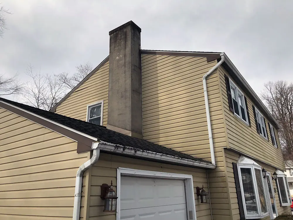 We enjoyed this project in Aston. This customer asked us to remove their aging vinyl siding and replace it with James Hardie Lap siding and board and batten. For the new siding, these homeowners chose the color Cobble Stone, which is a pale gray. The difference in the dark color of the shutters and the light siding creates an elegant contrast in the curb appeal of this home.