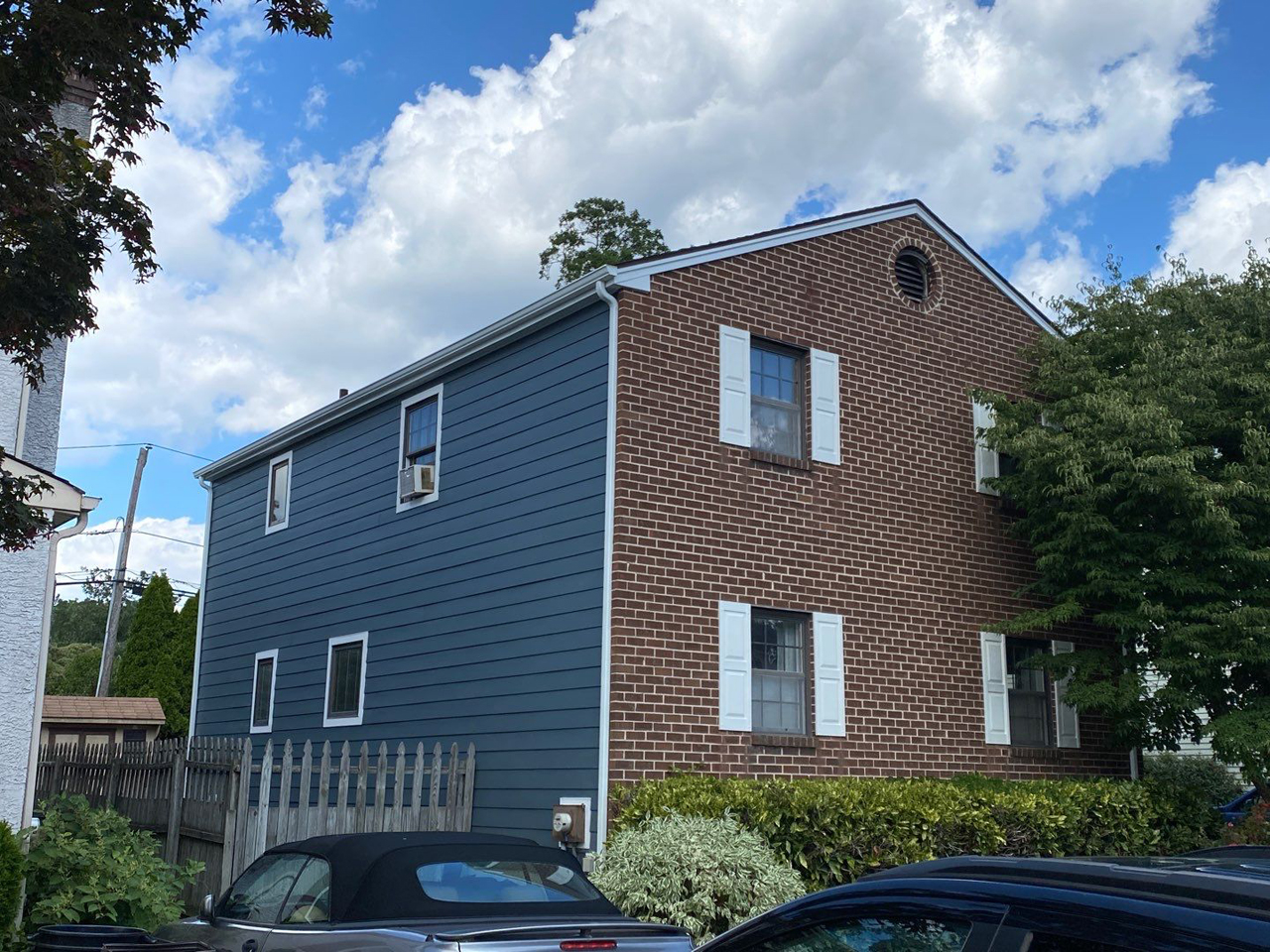 Our team installed new siding, gutters, fascia, window capping, soffit, and shutters for the two-story colonial. We installed James Hardie Cedarmill siding in a beautiful Evening Blue color. Even though the work on the home exterior was extensive, the project went very smoothly and was completed in just six days.